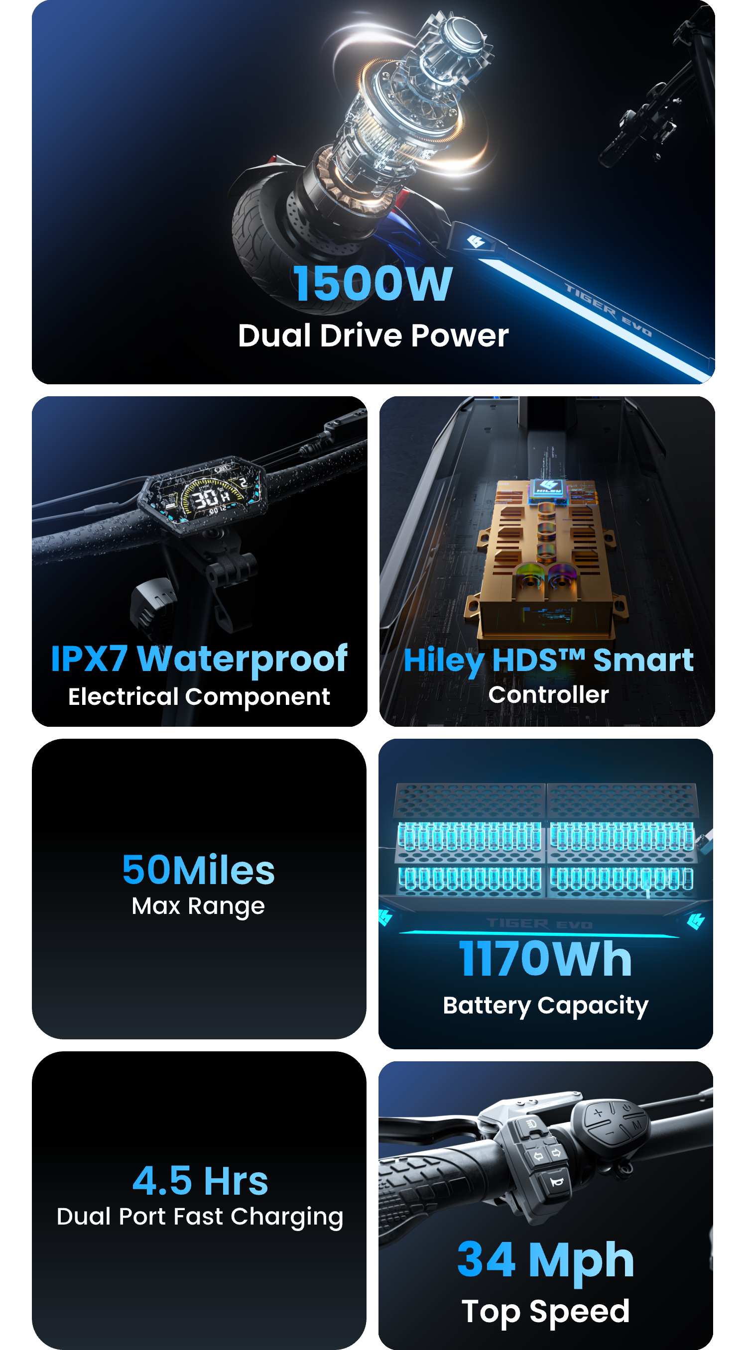 Powered by a 52V 1000W motor (1500W peak), this model hits 34 mph, perfect for city rides and light weekend cruising, with a balance of power and efficiency in a lightweight build.