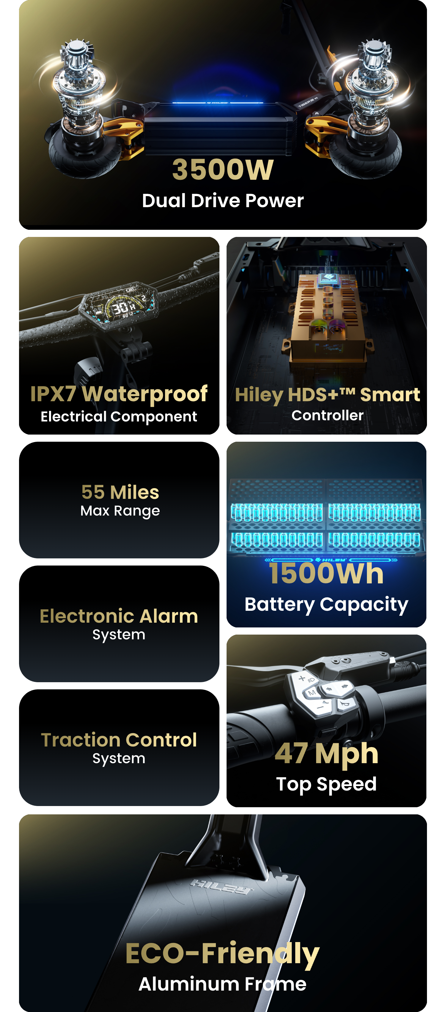 This lightweight 60V dual-drive setup delivers peak 3500W performance, reaching speeds up to 47 mph for a nimble and durable ride.