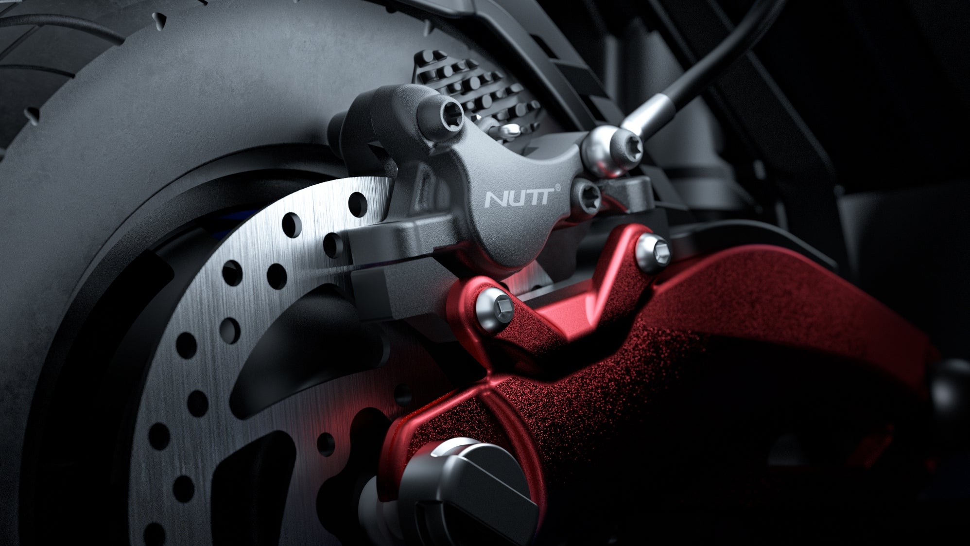 NUTT hydraulic brakes with ventilated pads deliver reliable high speed stopping without racing system weight. Balancing safety, simplicity, and confidence for long city rides or light off-road.